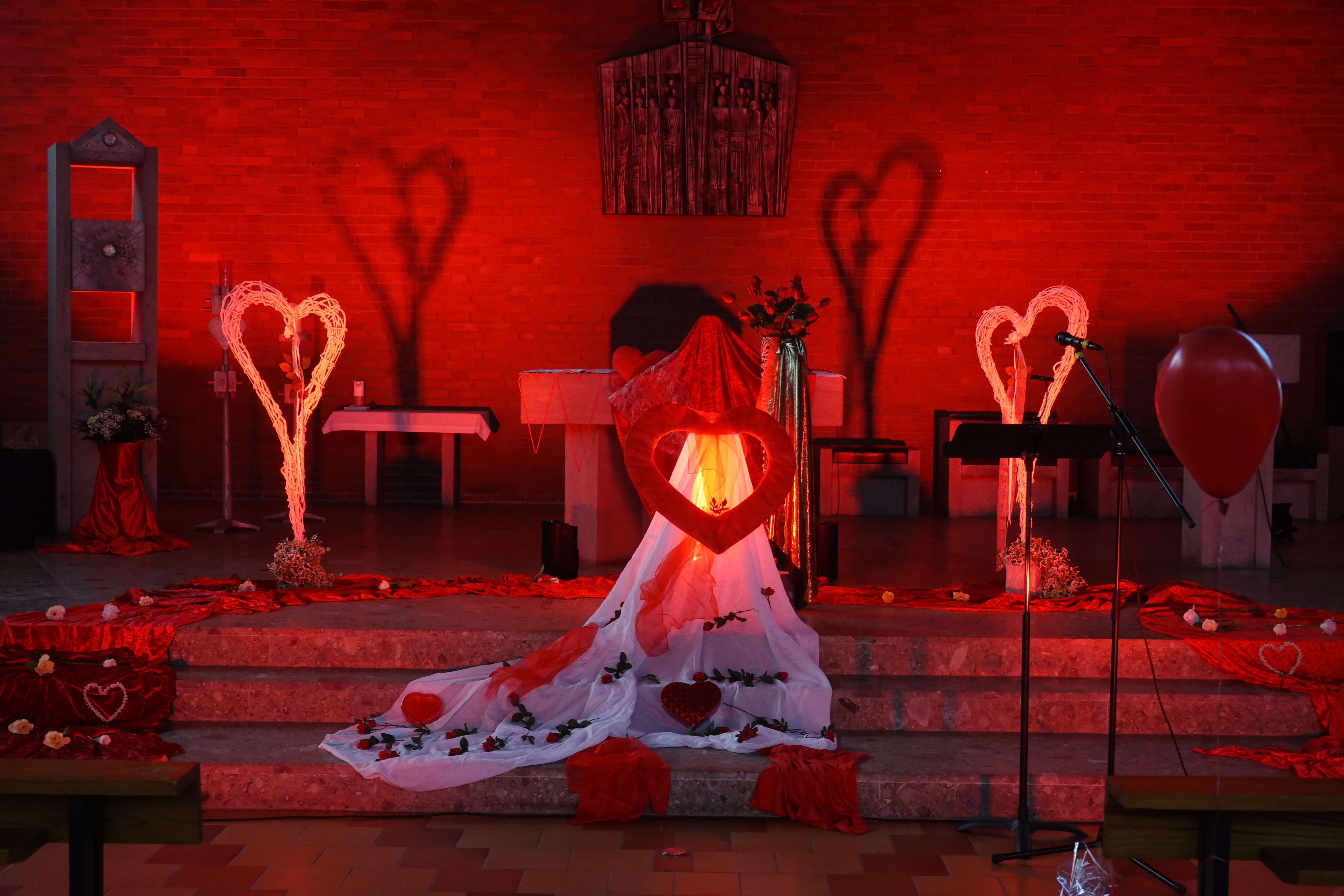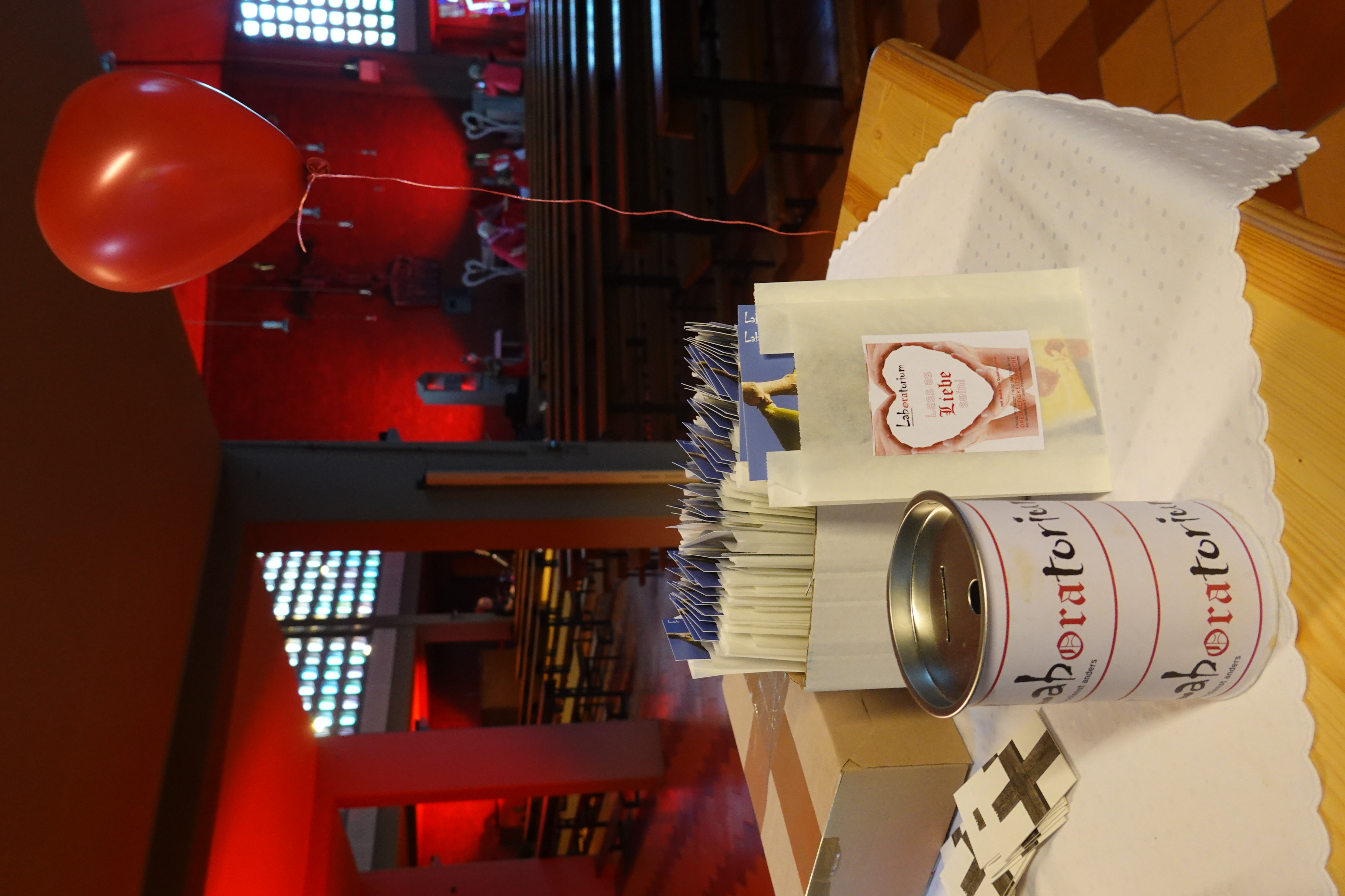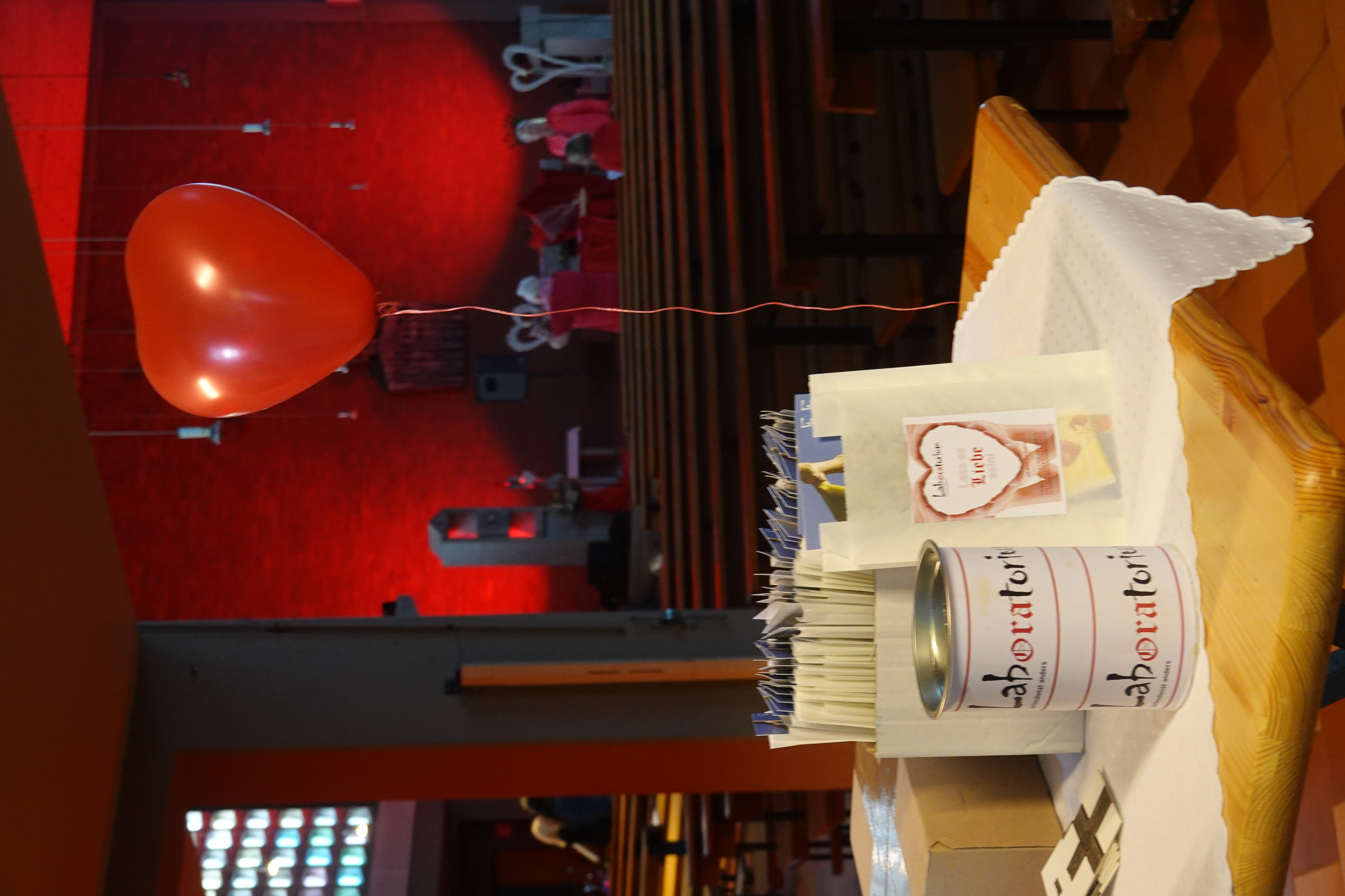 Ein Kirchenraum in leuchtendem Rot. Herzen, die ihre Schatten an die Mauern des Chores werfen, Luftballons, „Love is in the Air“. So begann der besondere Gottesdienst des Teams Laboratorium. Das Publikum wippte mit den Füßen und erfreute sich an der ausgefallenen Atmosphäre.