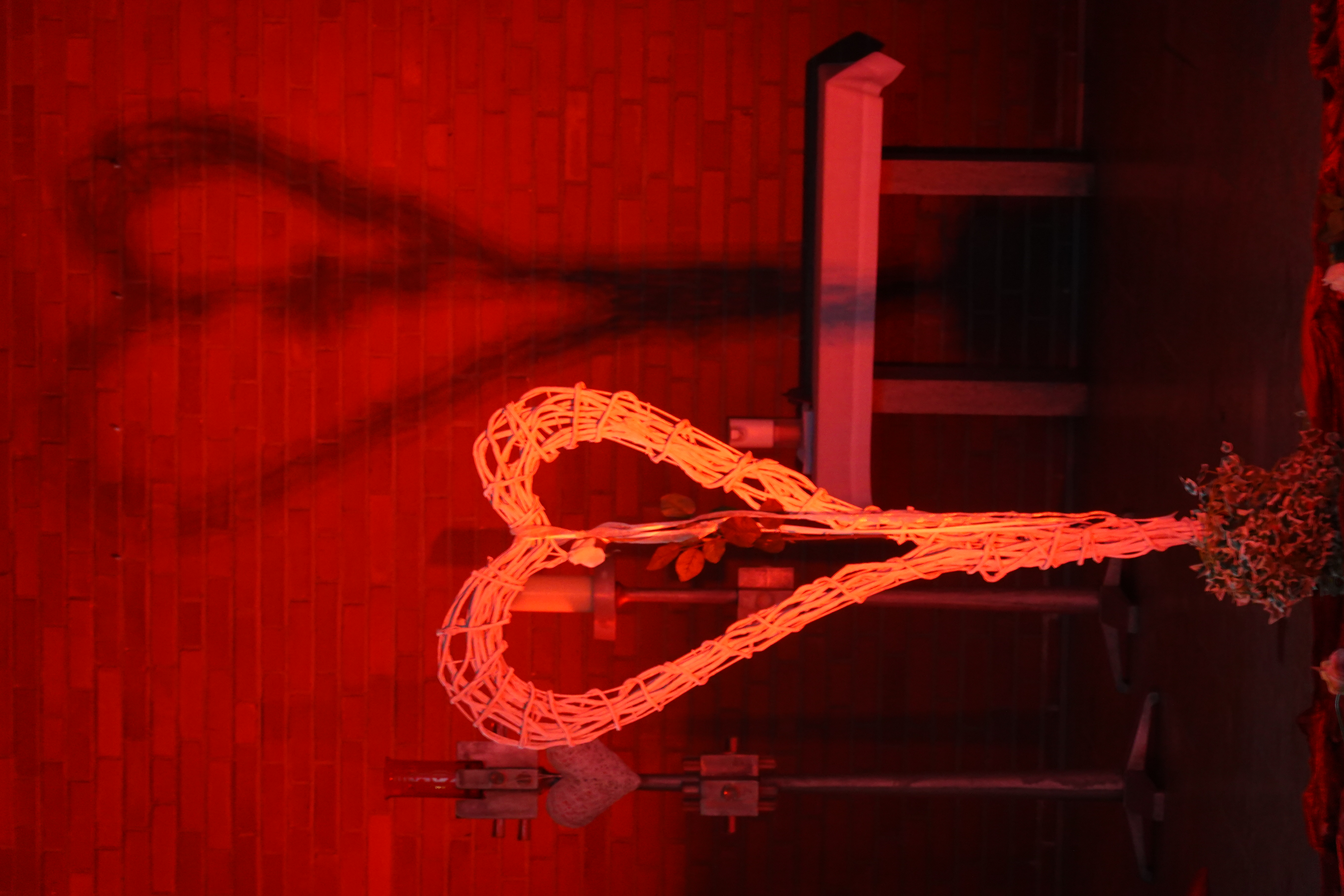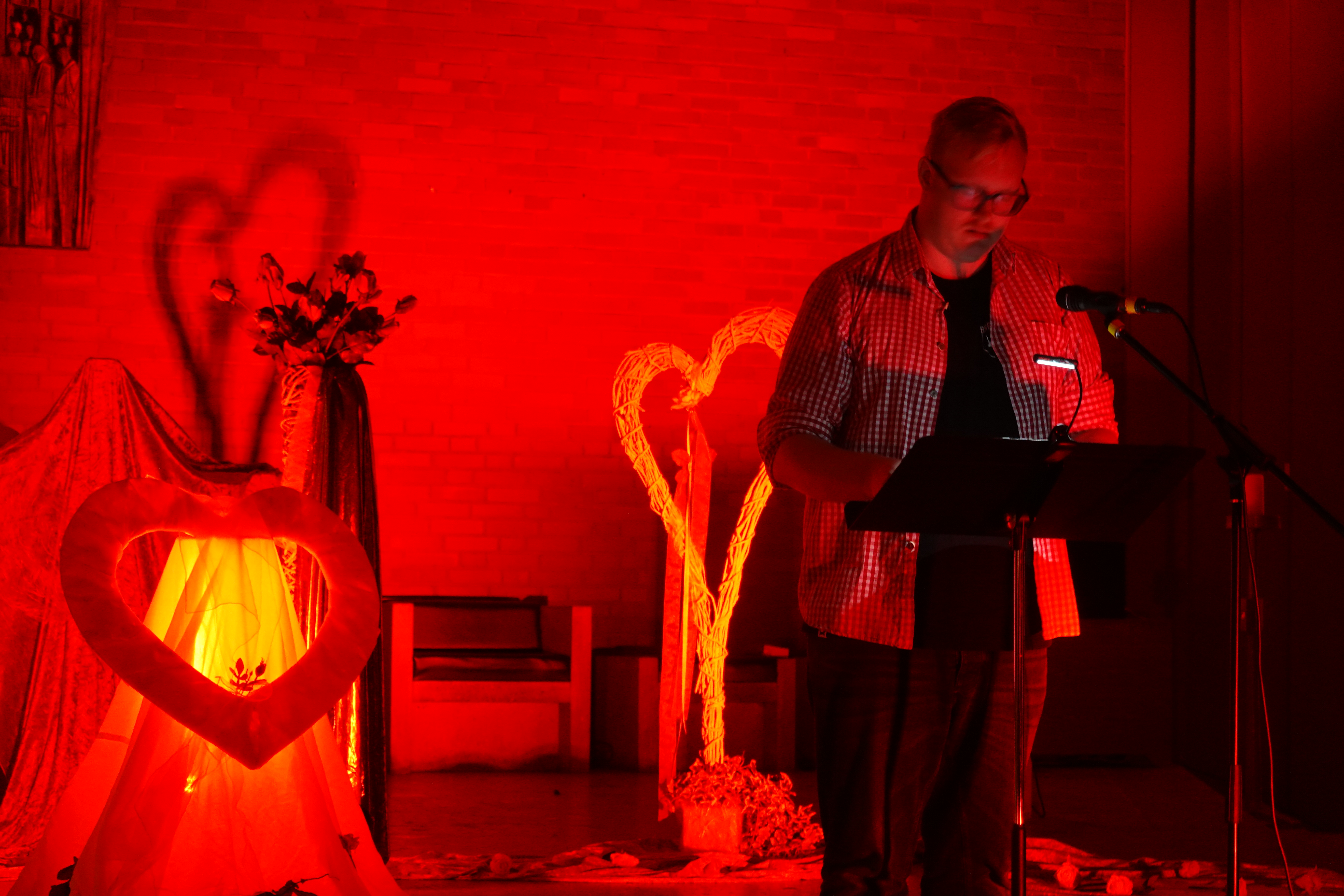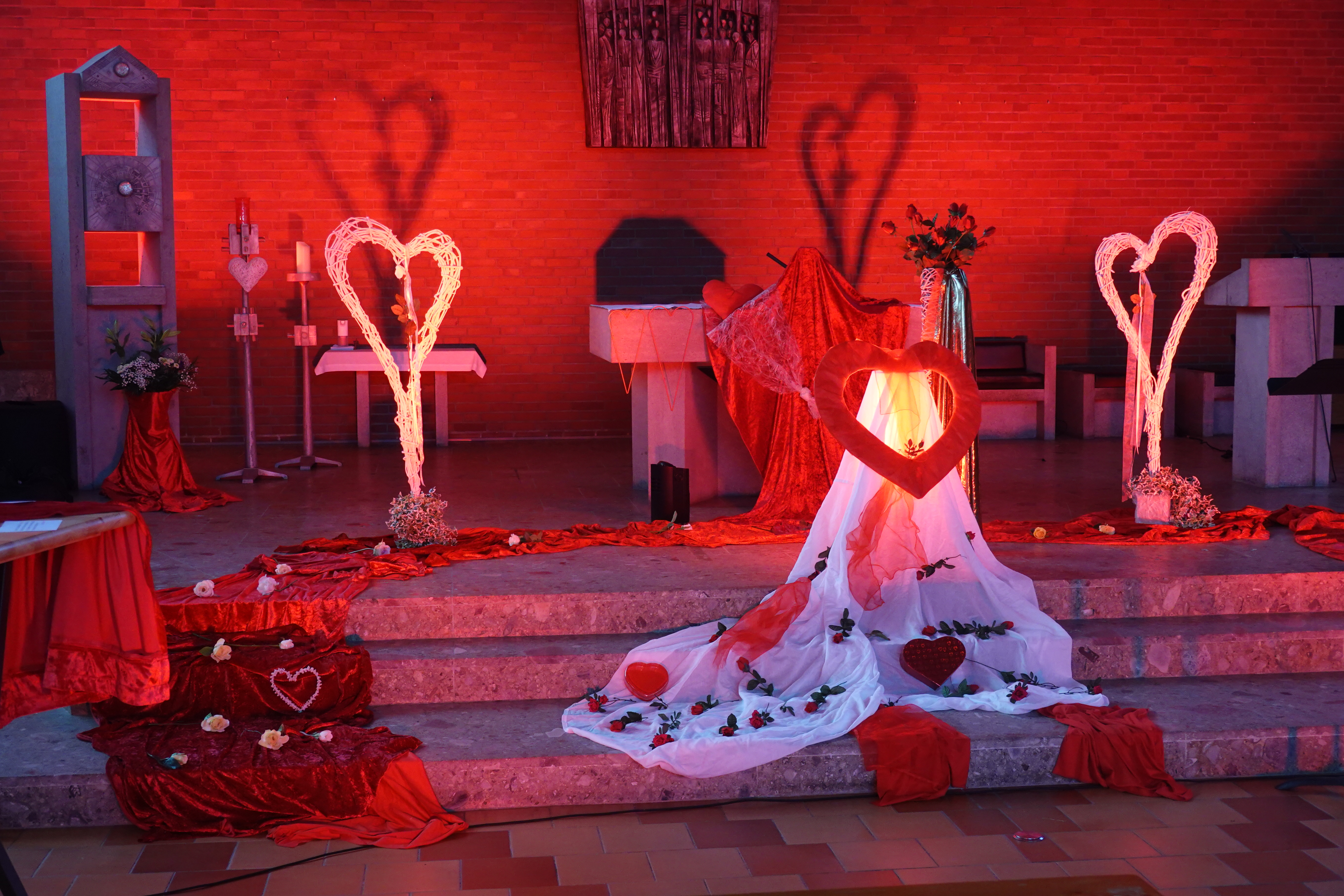 Nicht nur die verliebte Liebe wurde rot beleuchtet und dies in jeder Form. Das Lichtspiel führte alle Blicke auf sich ziehend zum Höhepunkt - zum modernen Kreuz des Altenoyther Kirchenschiffs und lenkte damit die Aufmerksamkeit auf die Mitte des Kreuzes als den Ursprung der Nächstenliebe, die auch eine gehörige Portion Respekt dem eigenen ich gegenüber einschließt.
